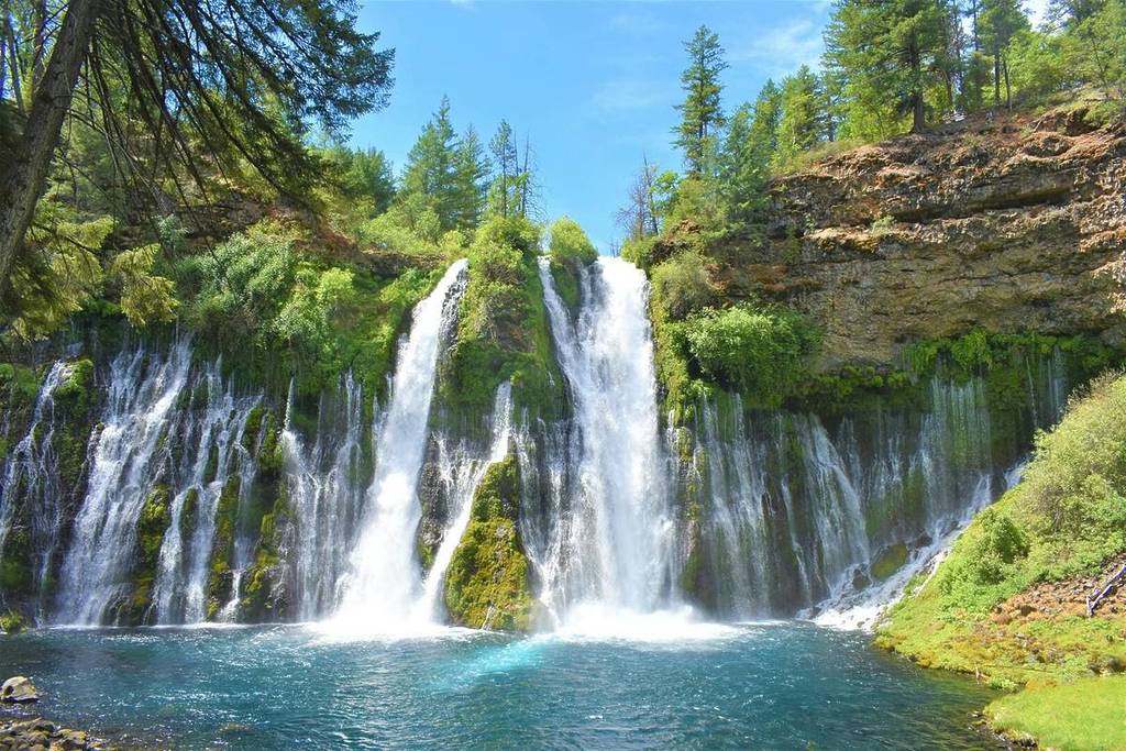 You only need to take a short hike for the best views of Burney Falls, which stretch 129 feet tall and nearly 300 feet wide. The water cascades over a mossy cliff draped with thousands of ferns, pouring not only from above but also straight through the rock face itself.